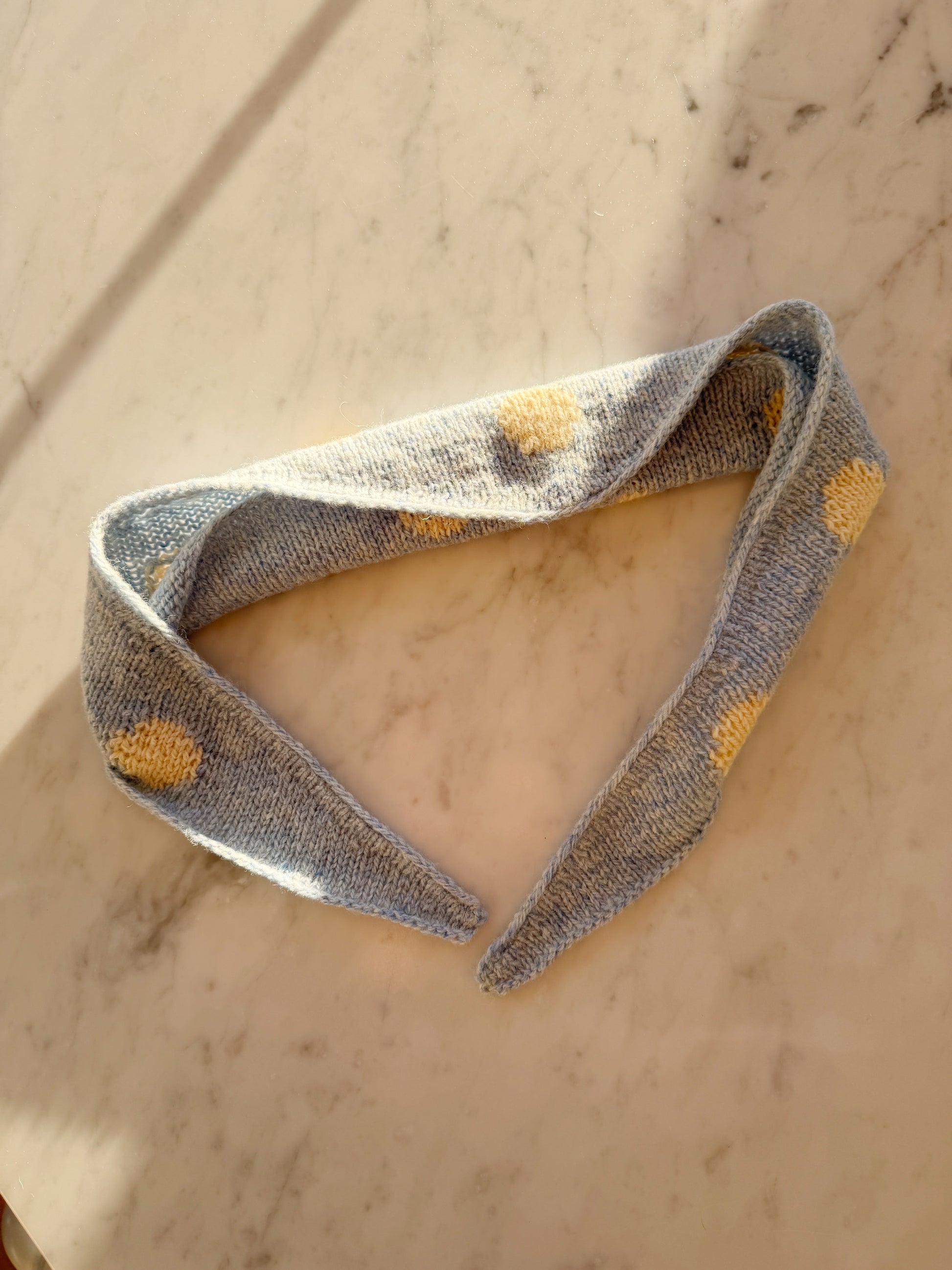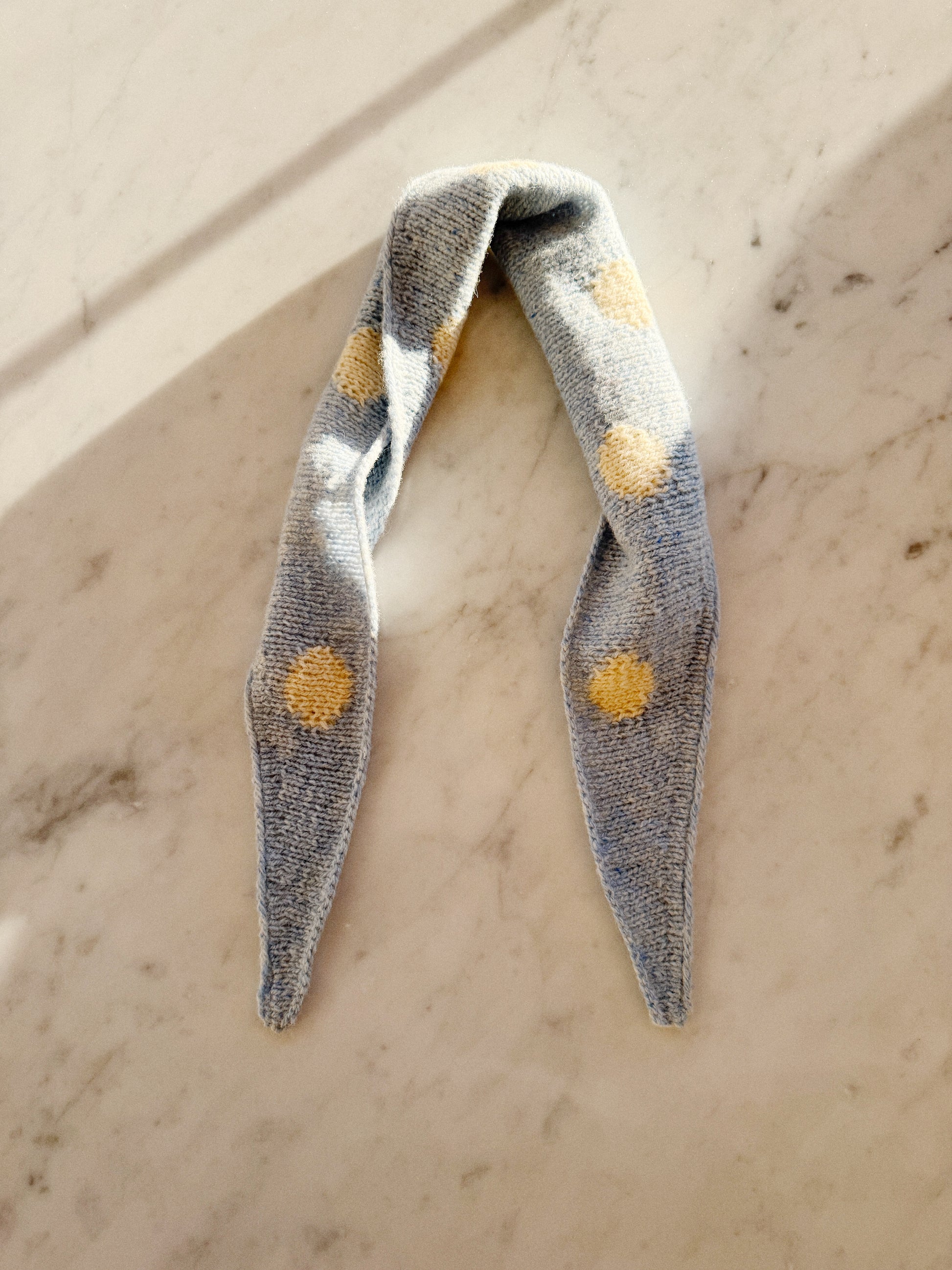 Fri Scarf is worked top down in stockinette stitch with intarsia dots. The construction is simple, and the intarsia section is clear and beginner-friendly, as only one dot is worked at a time. The pattern includes full-size charts.