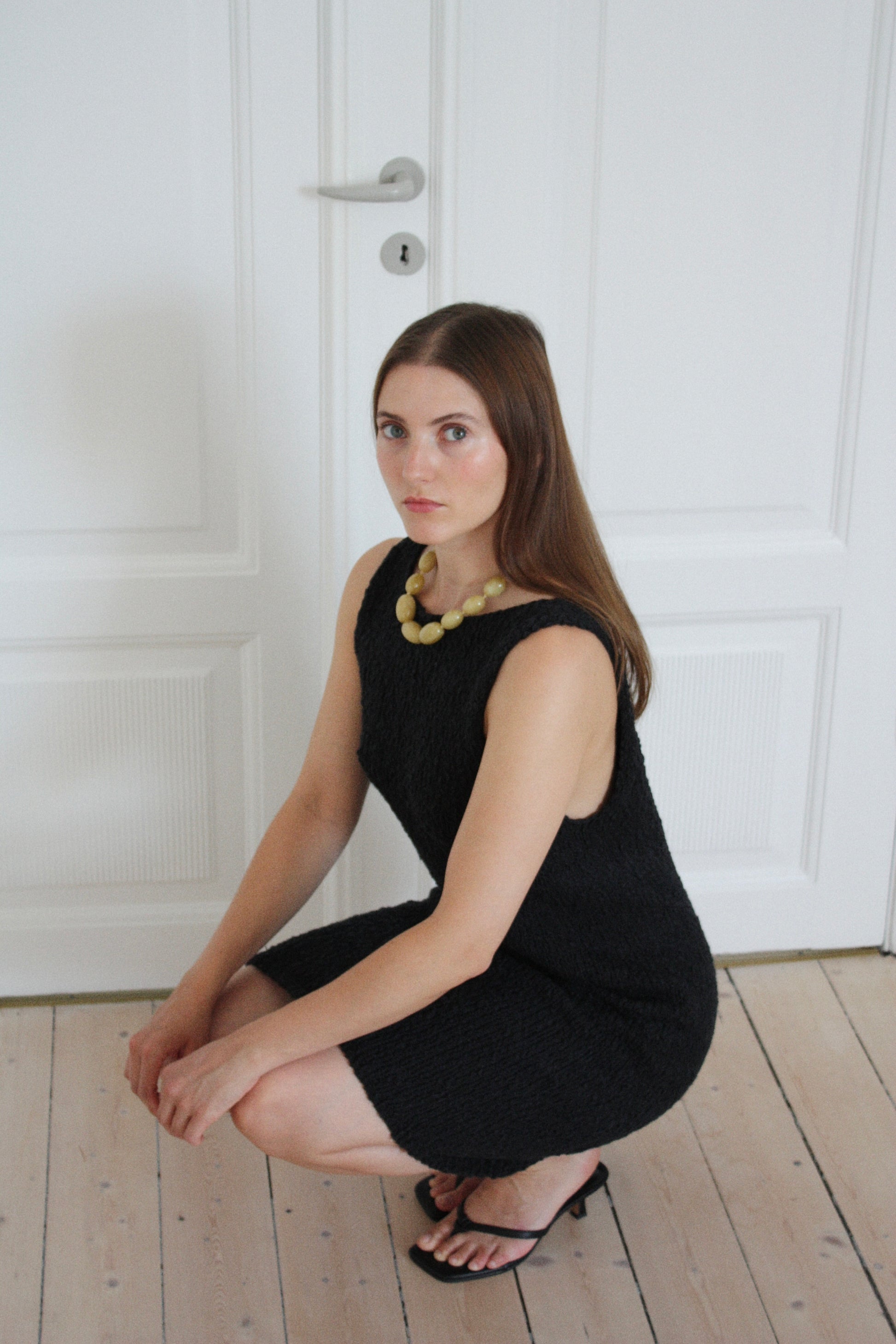 The dress is knit from the top down. First the front is knit flat to the bottom of the arm hole. Then pick up stitches for the back along the cast on edge. The back is knit flat to the bottom of the arm hole, where the front and back are joined. The dress is knit in the round the rest of the way. Hips are shaped by increases.