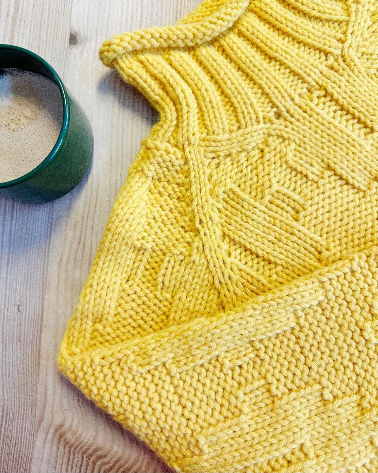 The sweater is knit from the top down with raglan increases. At the beginning the sweater is worked back and forth in a texture stitch pattern, while the neckline is shaped. After the neckline the sweater is worked in the round. The texture pattern is knit from charts. The turtle neck is knit at the end.