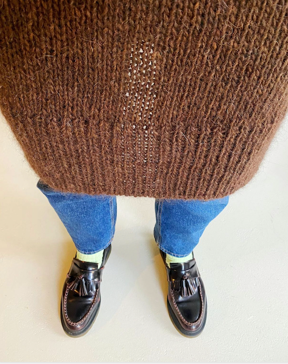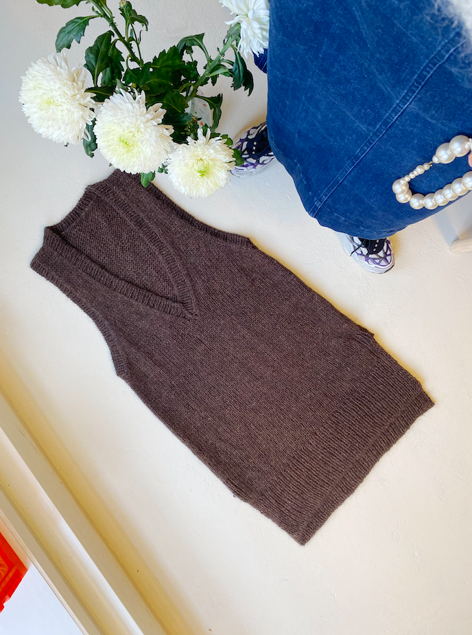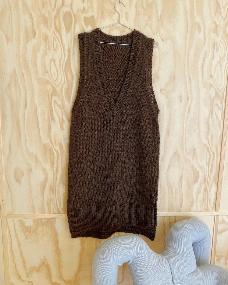 Treasure Vest Long is worked top-down and has no finishing work besides weaving in the ends. The vest has a V-neck on the front.