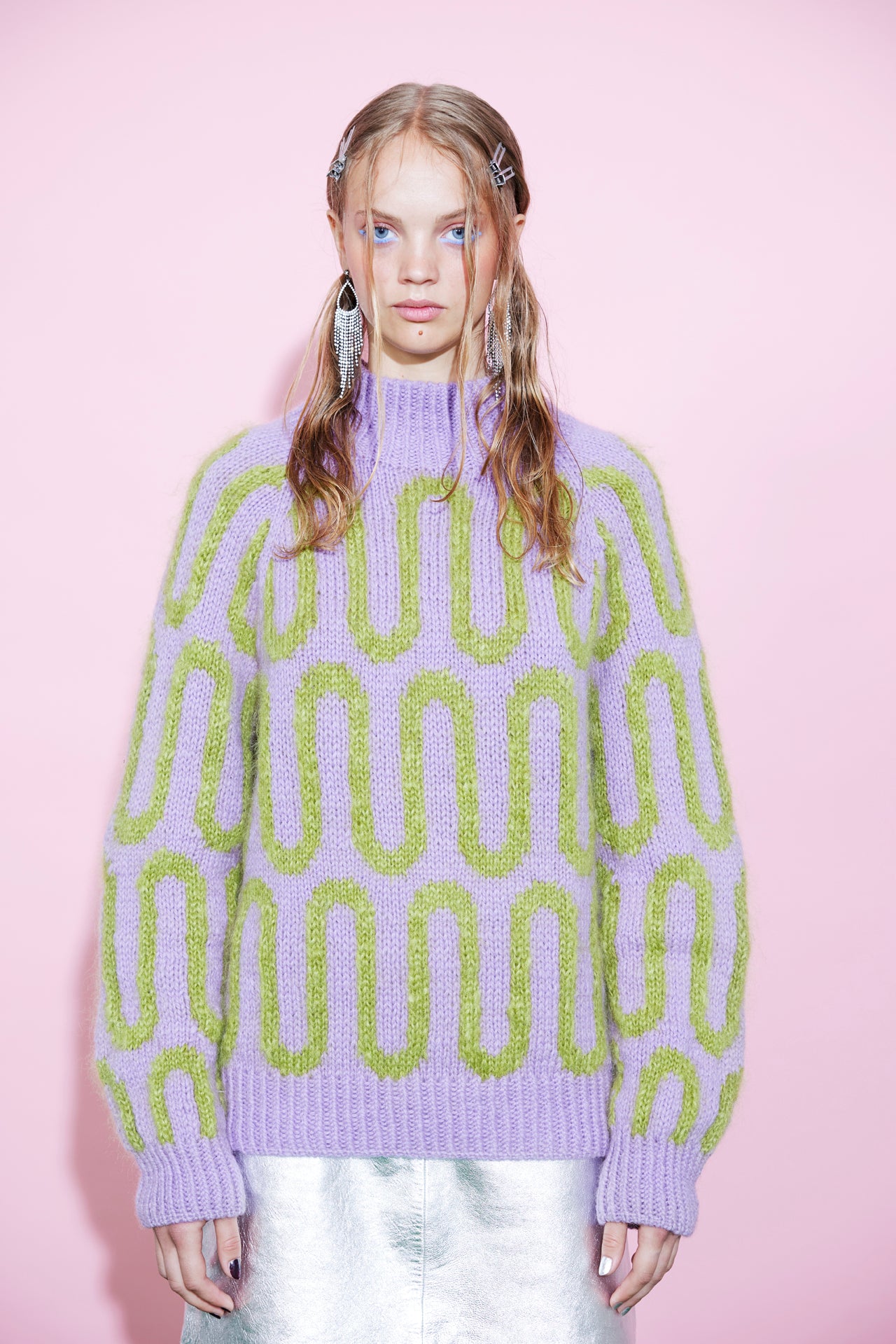 Wave Sweater features a striking stranded pattern and a turtle neck in twisted rib. The sweater is worked from the top down.