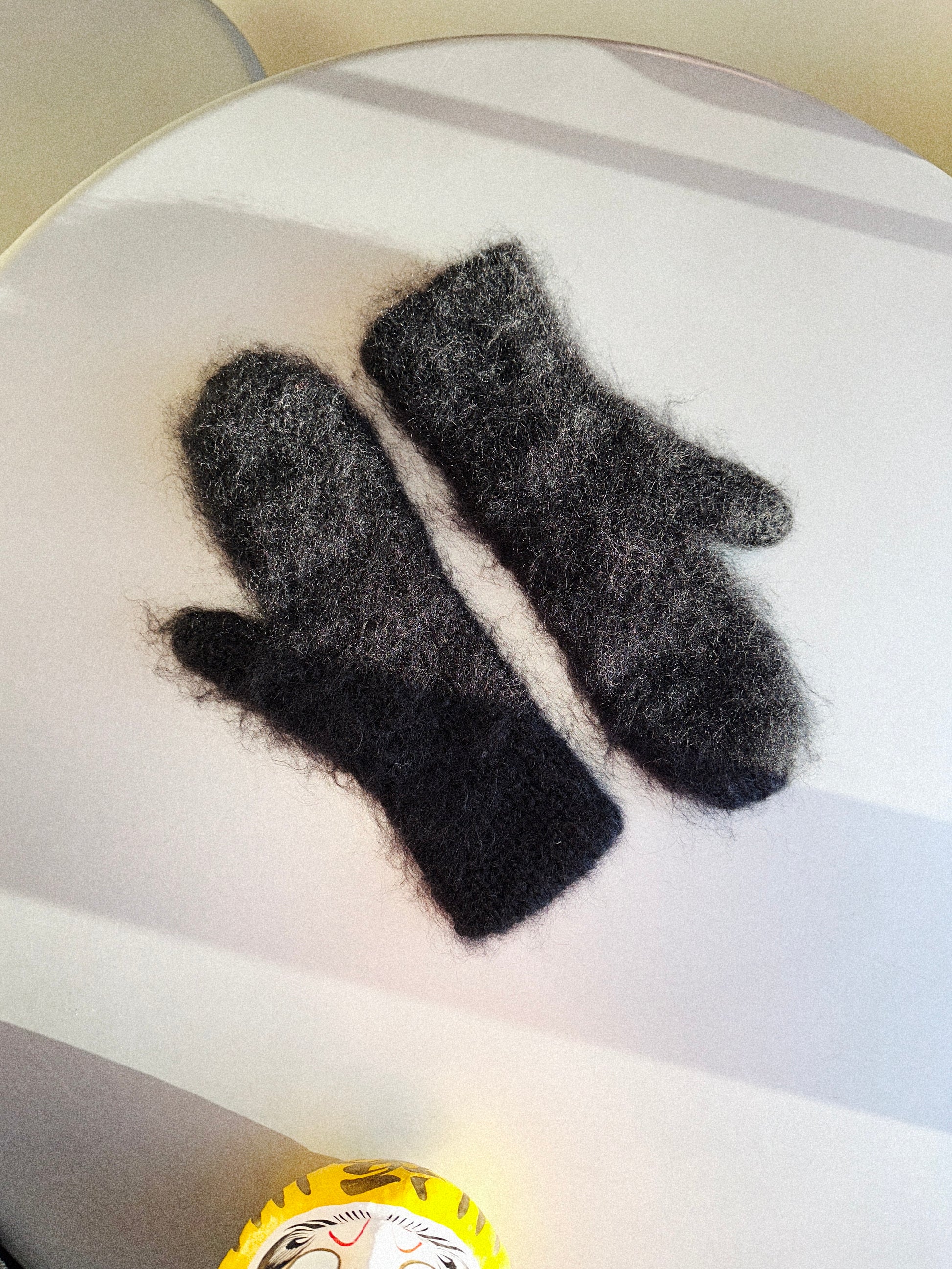 Fat Fur Mittens is a pair of thick, lined mittens. The mittens are knit in a long haired mohair yarn, which is brushed at the end using a mohair brush, which makes the fibers long, soft and furry.