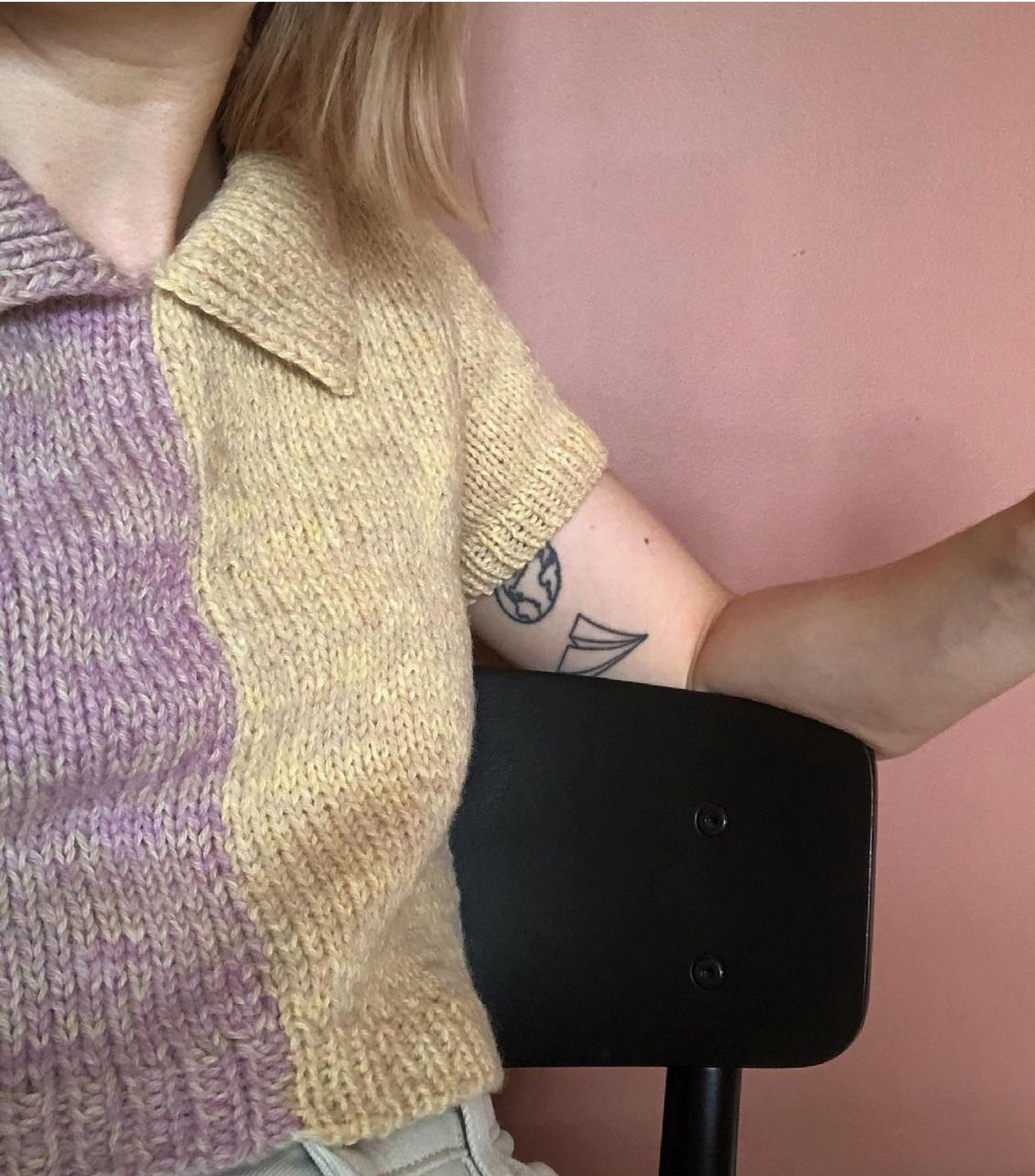 Breathable T-shirt with polo collar. The T-shirt is worked with three different yarn colours, one if which is used throughout the shirt. The contrast in the middle is worked with the Intarsia method.