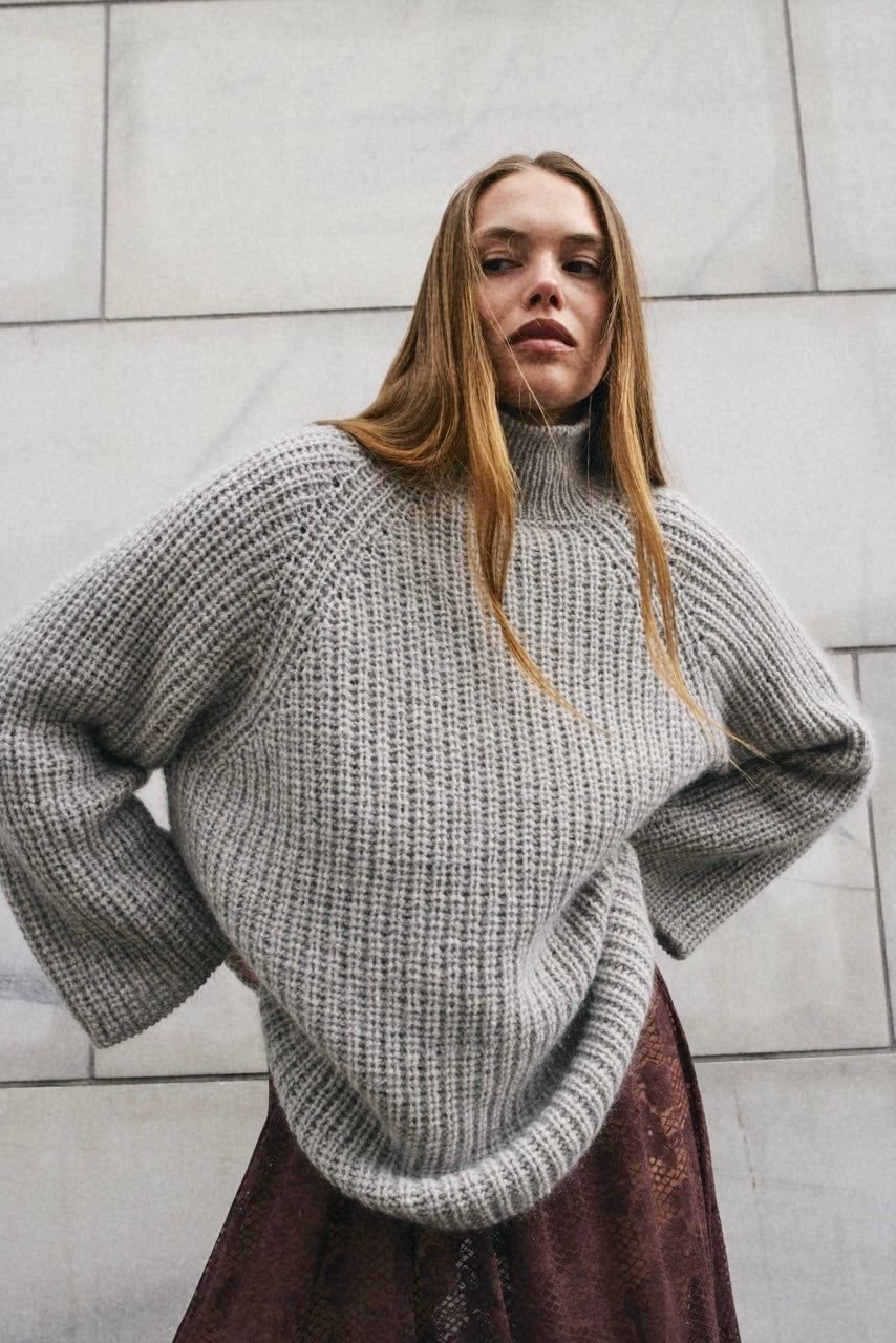 Nori Sweater is an oversized, long raglan sweater worked from the top down in half brioche stitch. The neck ribbing is worked at the end.