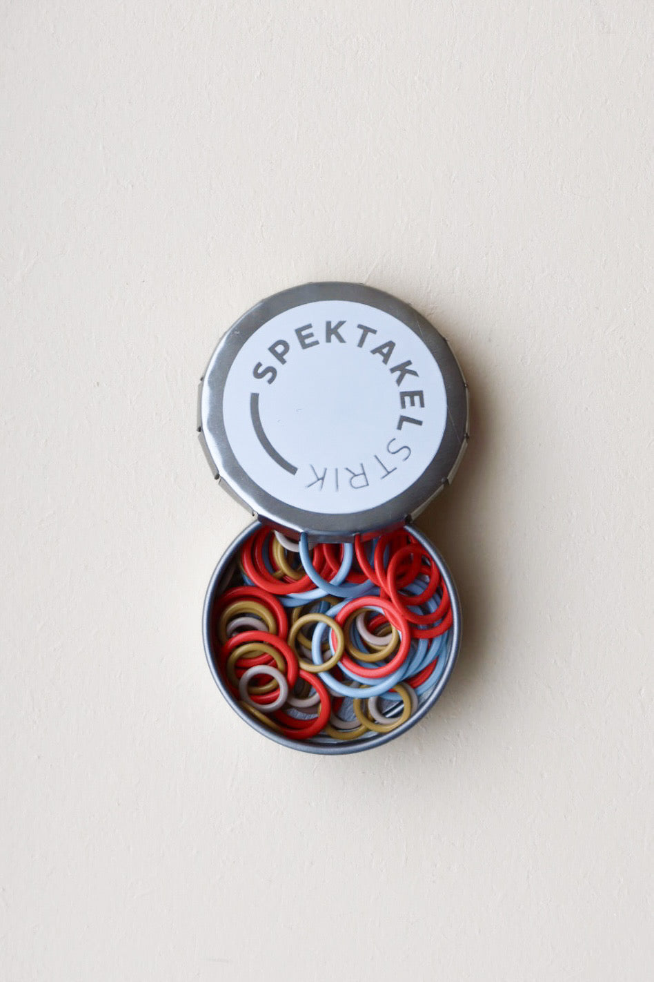 Can with 70 stitch markers in 4 different colors and sizes. The can can be operated with one hand, so it is practical when you are sitting with your knitting in hand.