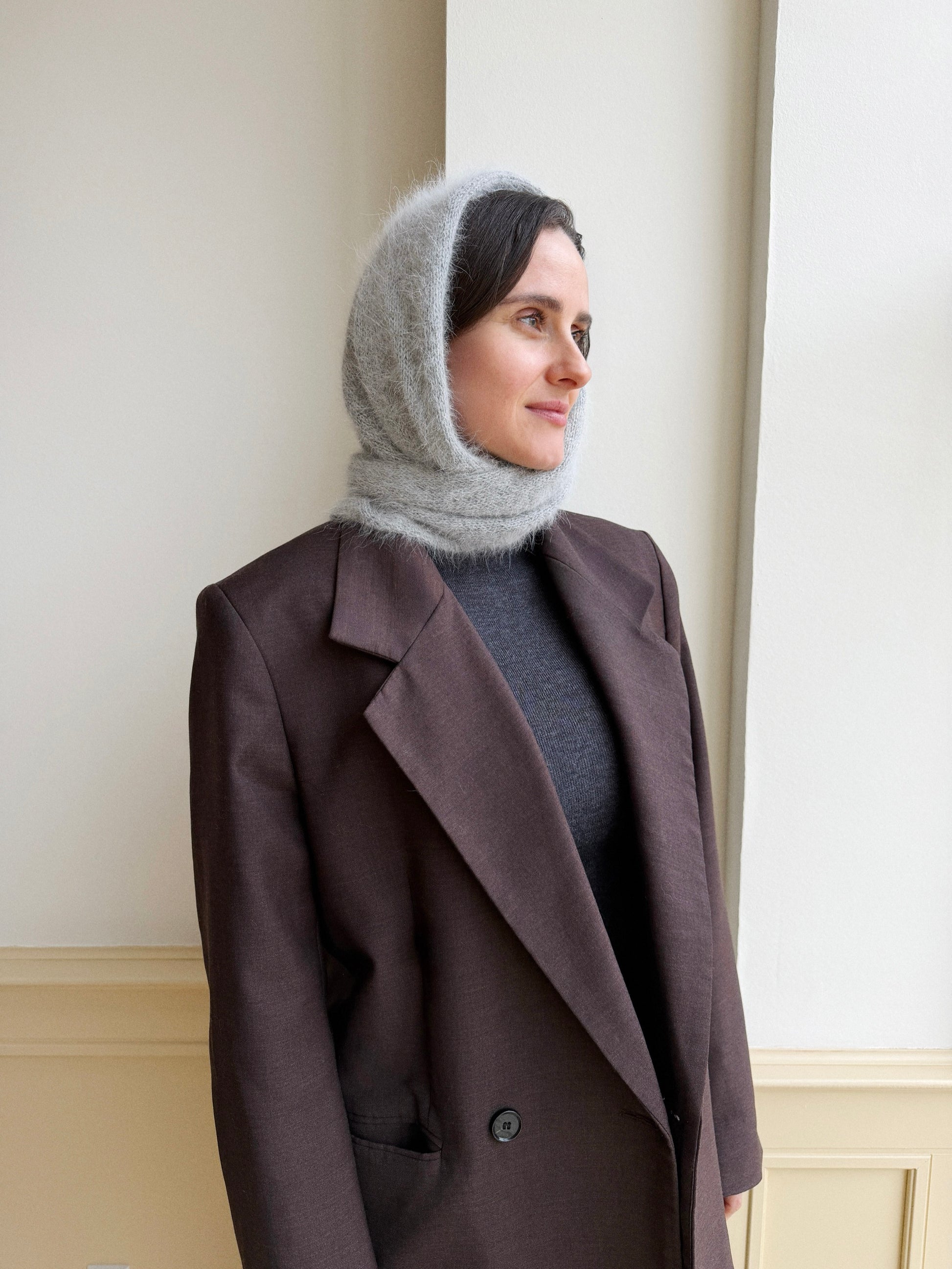 Det store (grå version) kan bruges som hætte, triangle-scarf, og nå 2 gange rundt om halsen.