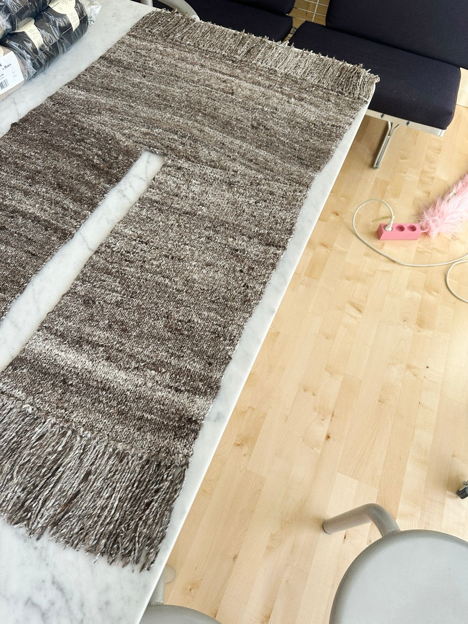 Arbejdet begynder med ryggen, som formes med vendepinde og strikkes nedad i glatstrik med ombuk i siderne. Derefter strikkes højre forstykke op langs kanten og strikkes nedad i samme mønster. Venstre forstykke strikkes på samme måde. Til sidst hæftes enderne, ombukket sys fast på vrangsiden, og frynser sættes på i bunden.