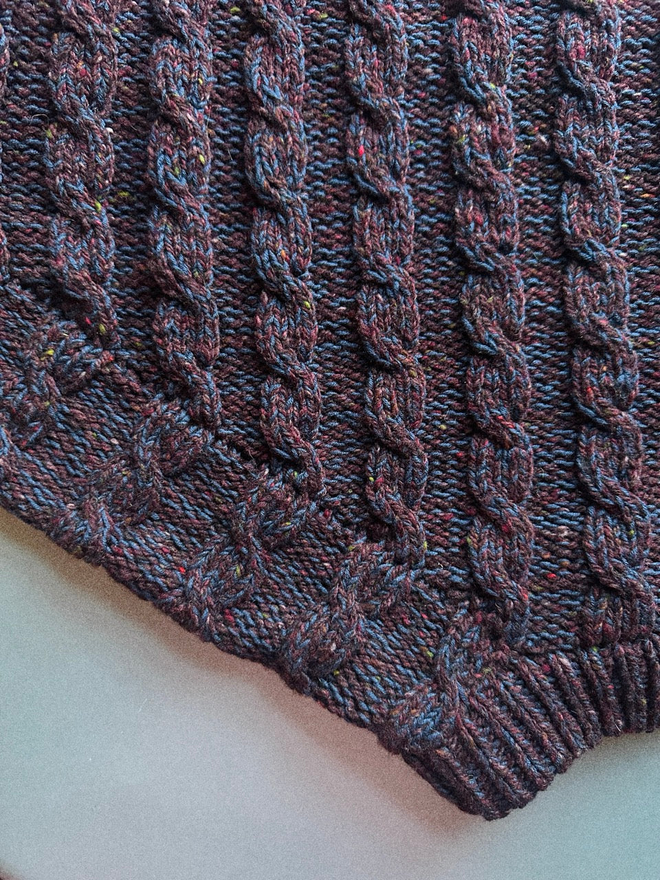 Cardiganen strikkes oppefra og ned i snoningsmønster. Først strikkes ryg og forstykker frem og tilbage til bunden af ærmegabet, hvorefter delene samles, og kroppen strikkes videre frem og tilbage. Ærmerne strikkes ned fra masker, der strikkes op langs ærmegabet, og formes med indtagninger. Til sidst strikkes halskanten, og cardiganen monteres med knapper.